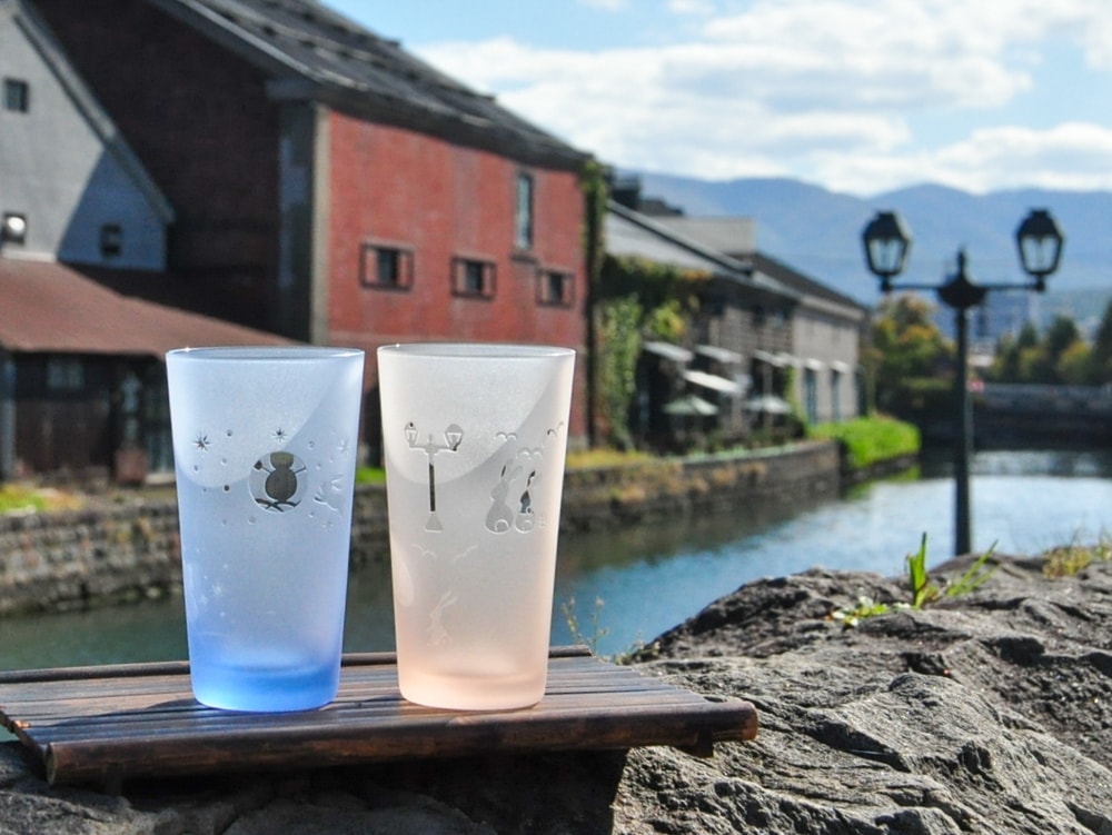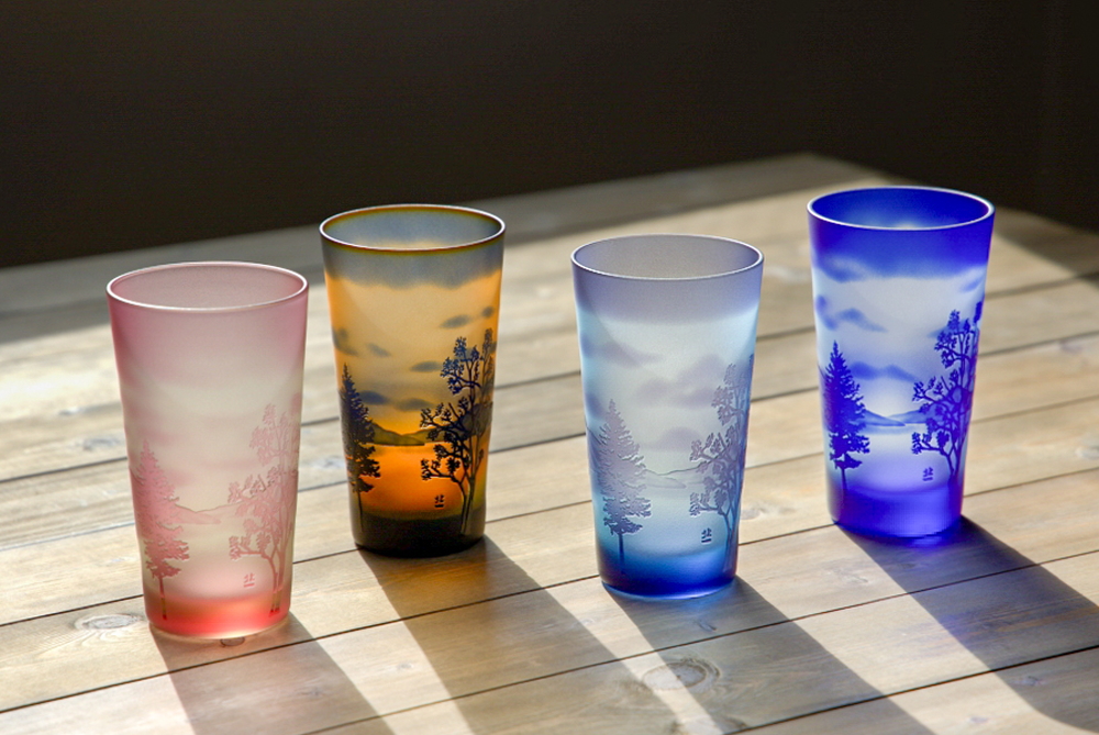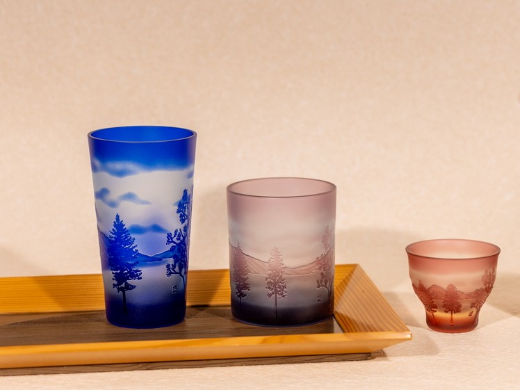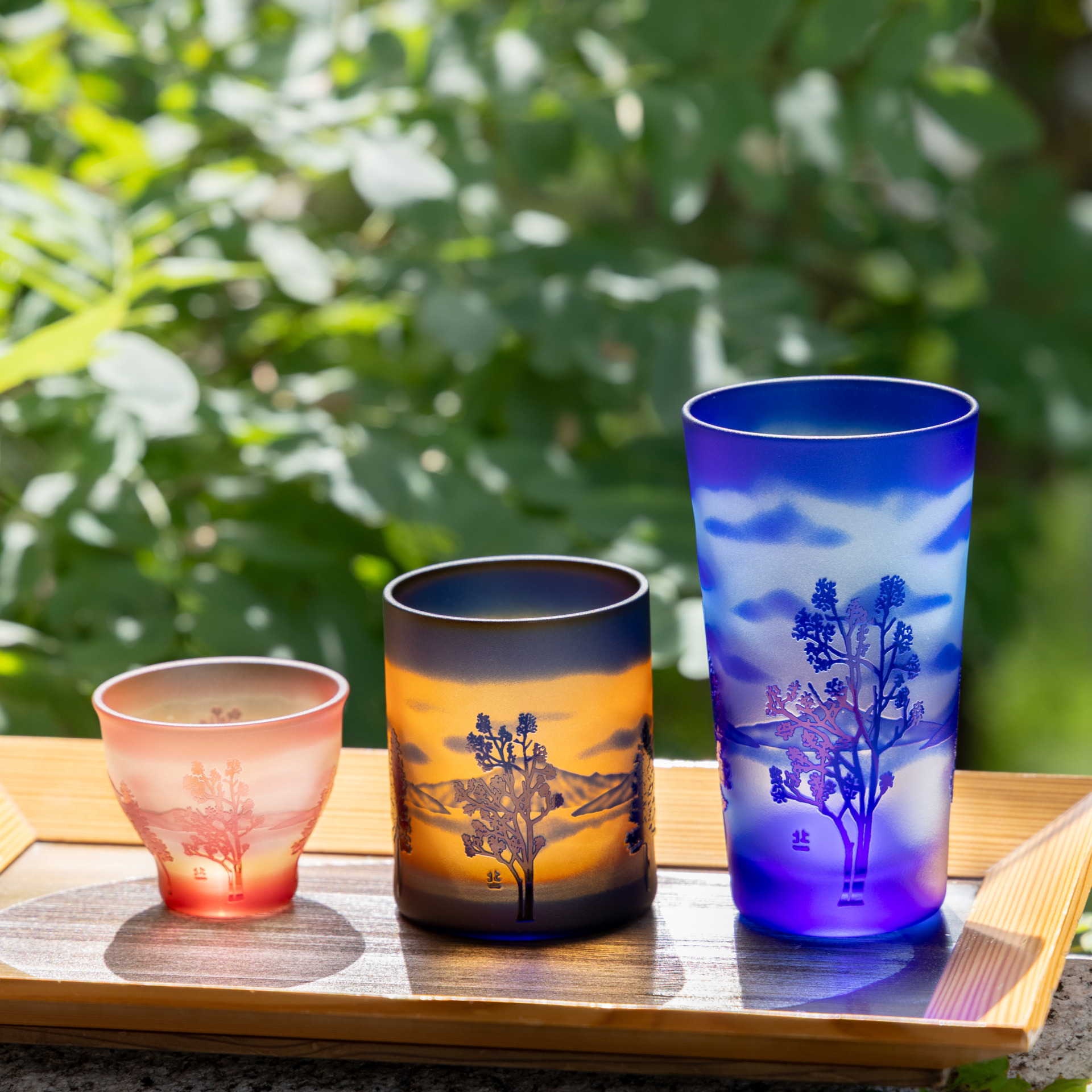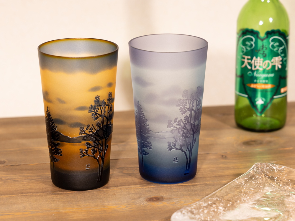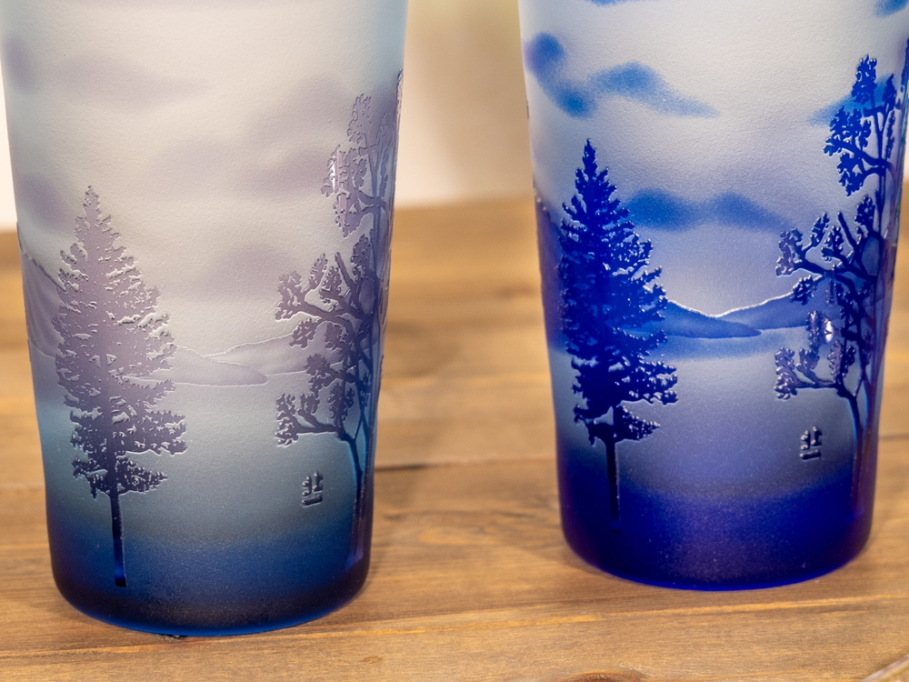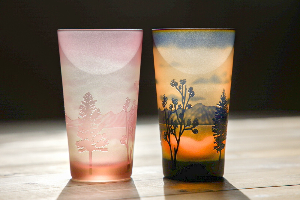 北海道の大地を思わせる木々や湖、山々を、高度なサンドブラスト技法でグラス外側に彫り込んだ職人技が光るデザイン。