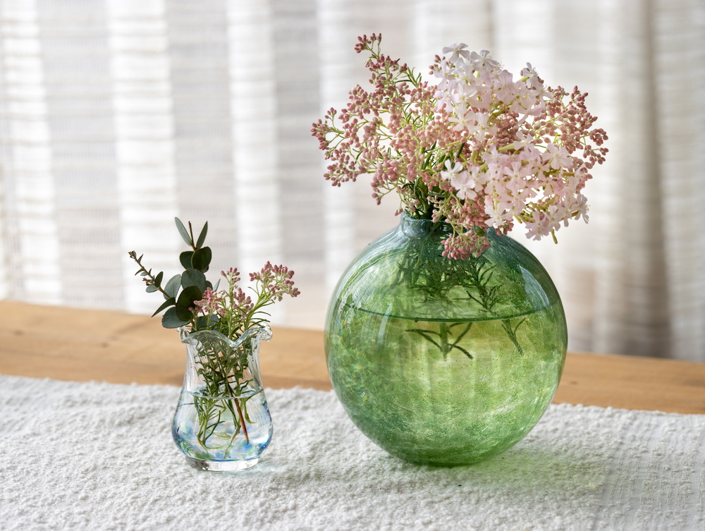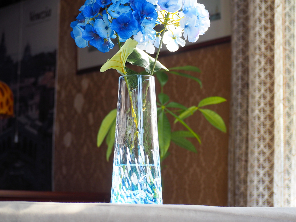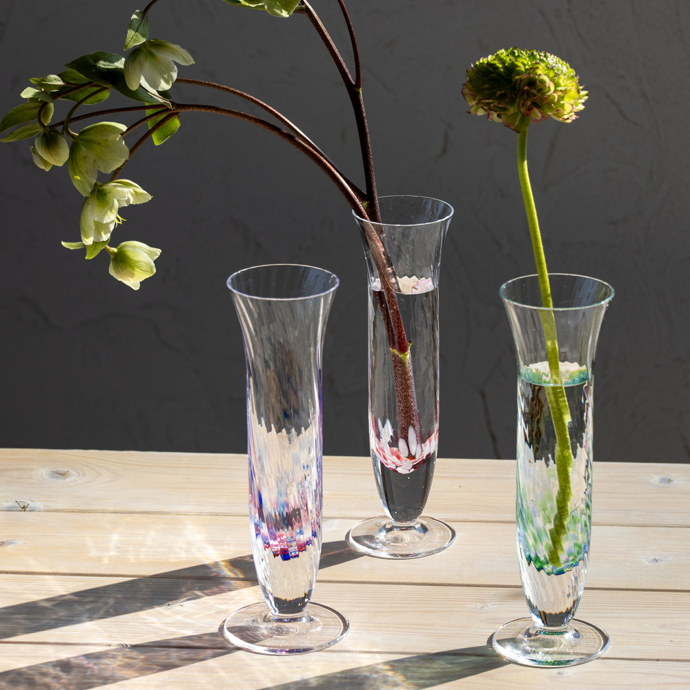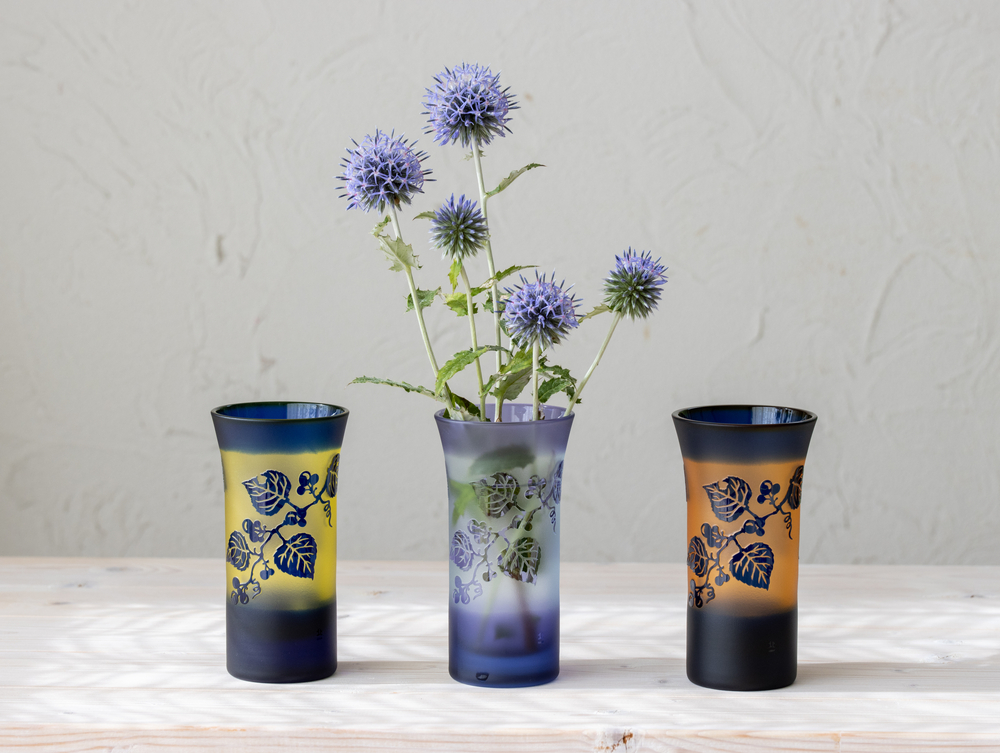 北一硝子の花器は、色も形も様々。