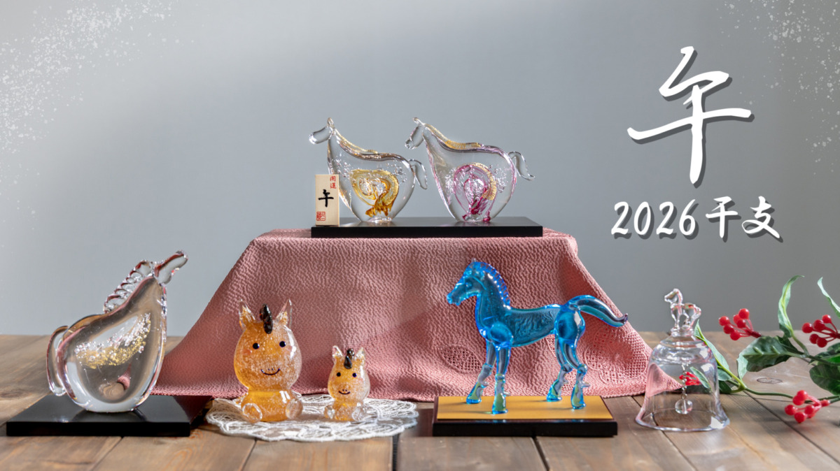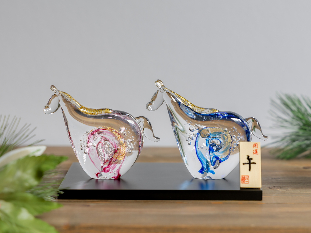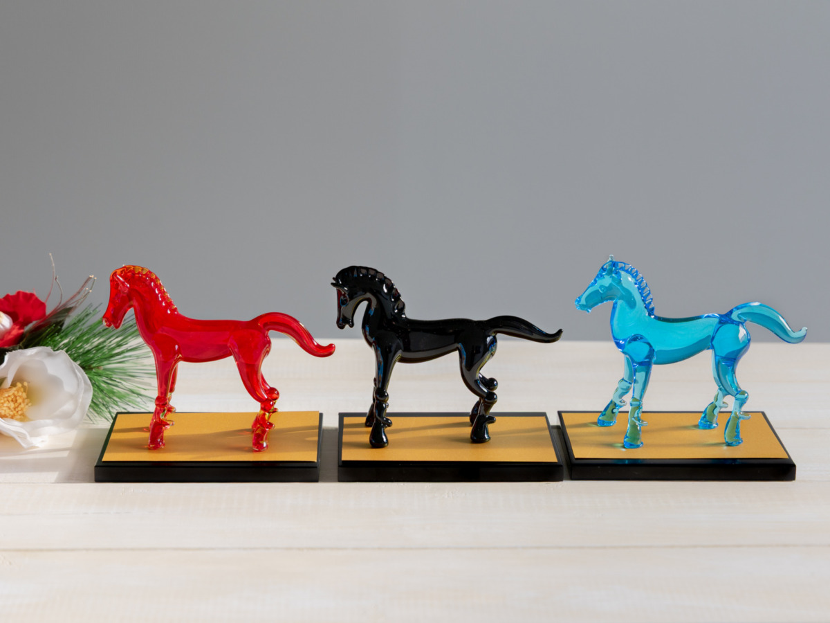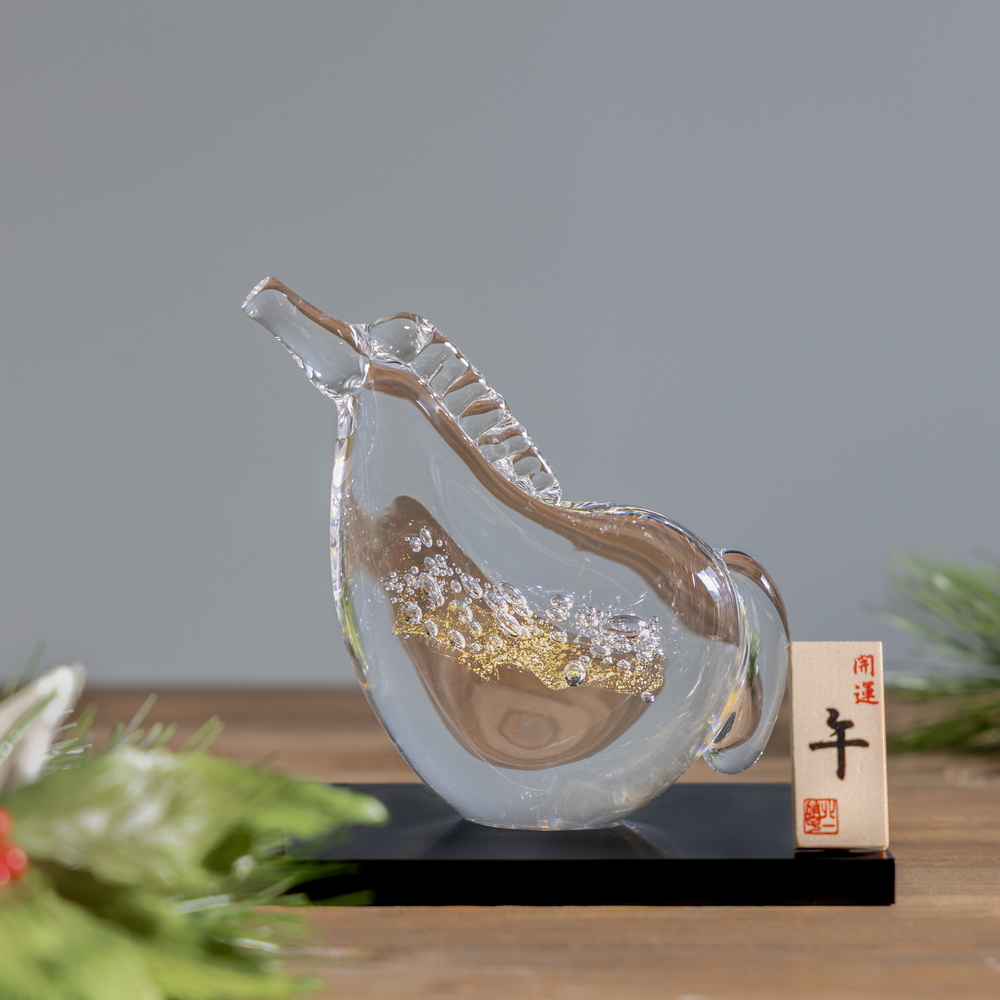 干支の「午」や馬をモチーフにした硝子のオーナメントは