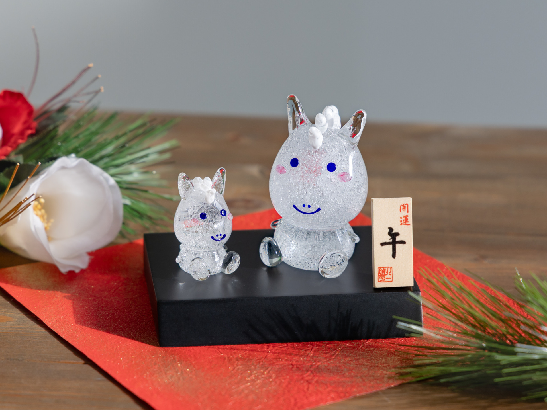 干支の「午」や馬をモチーフにした硝子のオーナメントは