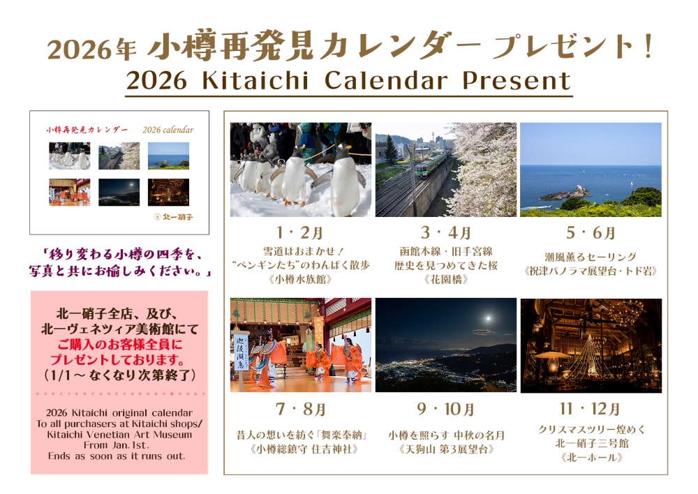 日頃からご愛顧を頂いております皆様に感謝の気持ちを込めて、2026年版、北一硝子特製「小樽再発見カレンダー」をご用意致しました。