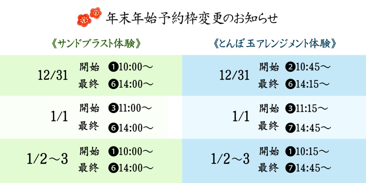 | ●体験時間の予約枠● 【サンドブラスト】スタート10:00~最終開始時間15:15 ①10:00~ ②10:30~ ③11:00~ ④13:00~ ⑤13:30~ ⑥14:00~ ⑦14:30~ ⑧15:00~ 【とんぼ玉アレンジメント】スタート10:15~最終開始時間15:15 ①10:15~ ②10:45~ ③11:15~ ④13:15~ ⑤13:45~ ⑥14:15~ ⑦14:45~ ⑧15:15~ ※上記時間帯の間で予約受付可能です。 ※ご予約状況によりお受けできない場合がございます。 |