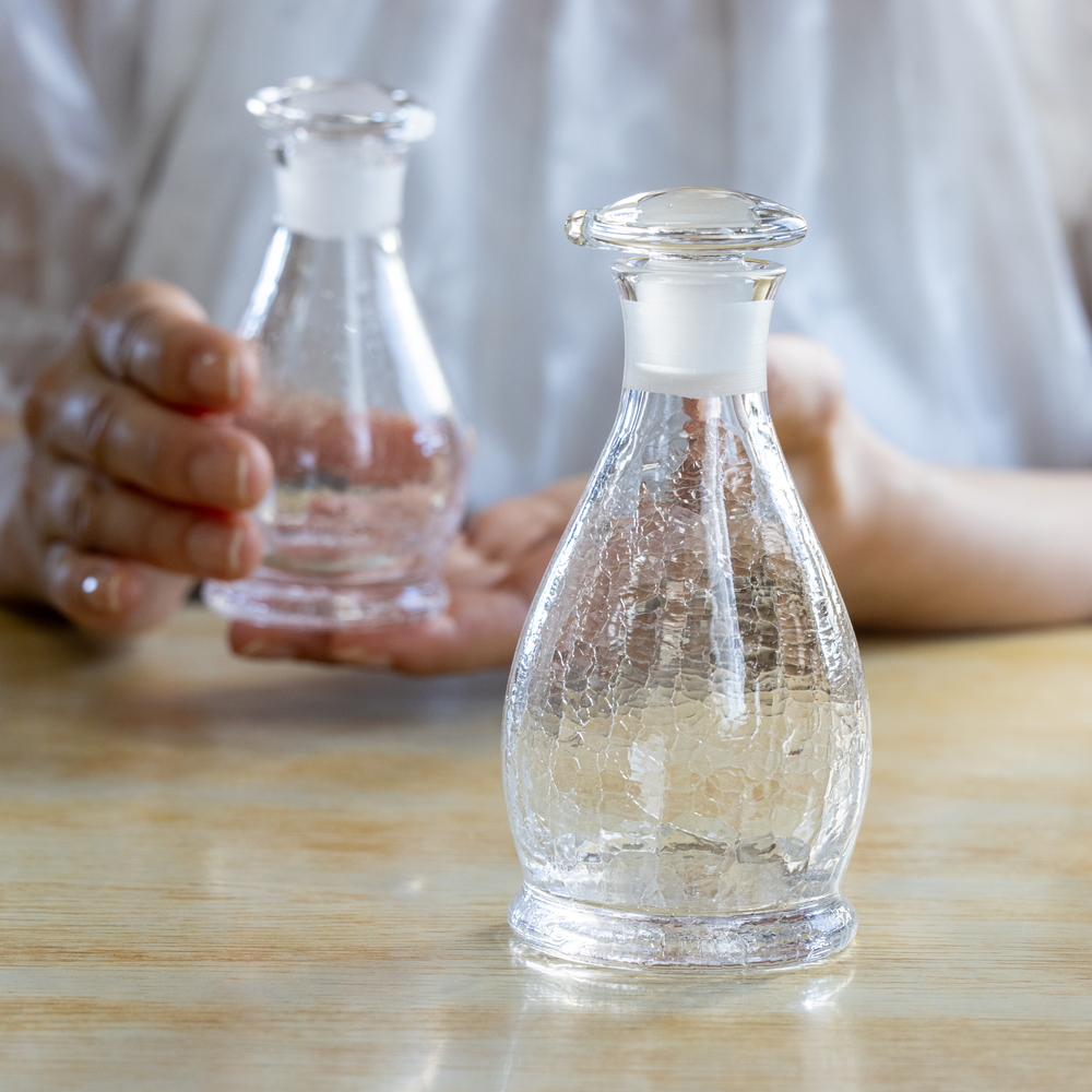 スリ硝子の性質上、スリ合わせ部分に塩分がたまったり、力が加わって本体と蓋がかみ合うことで、蓋がはずれにくくなってしまう場合がございます。
