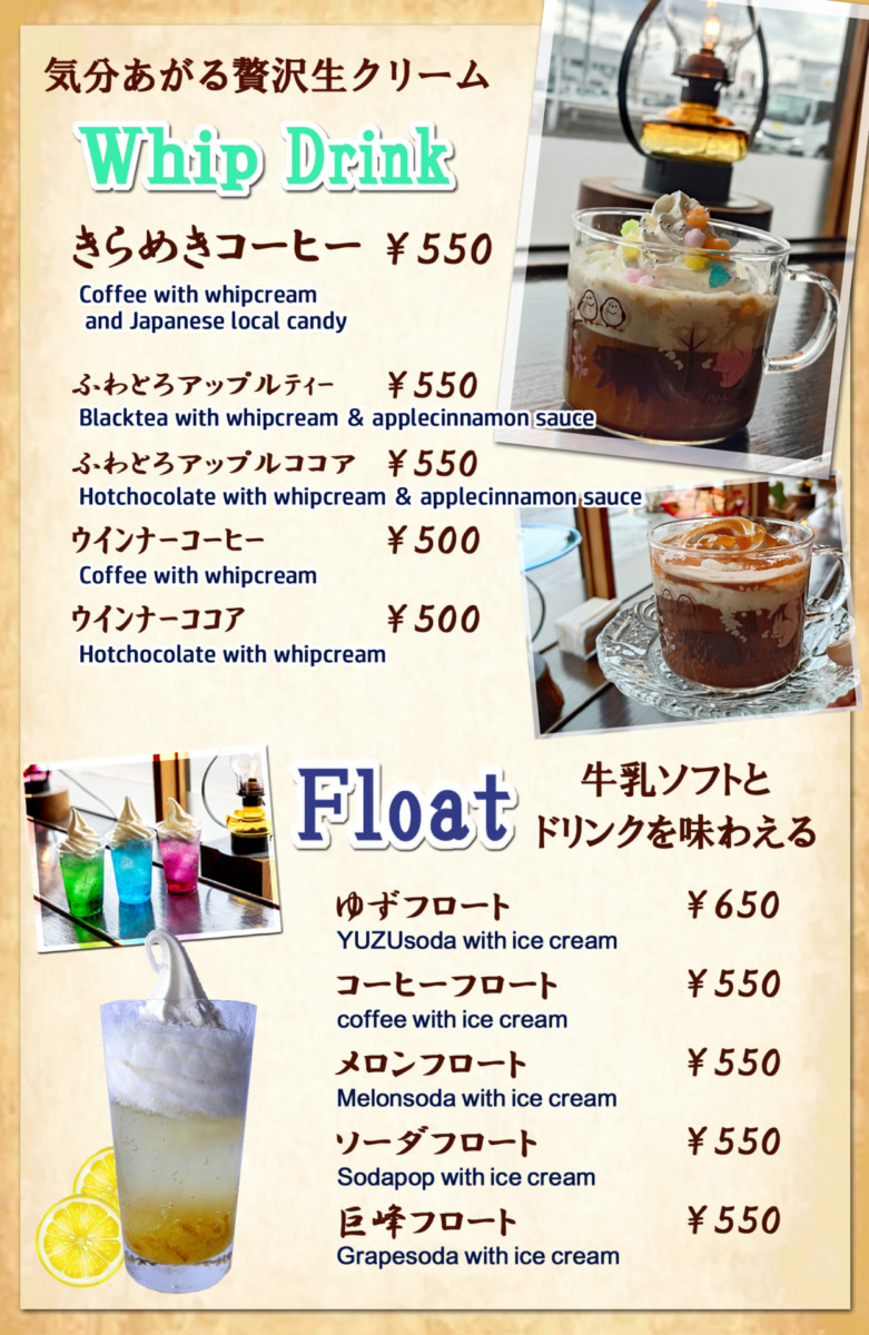 詳しくは下のソフトクリームメニュー、ドリンクメニューを