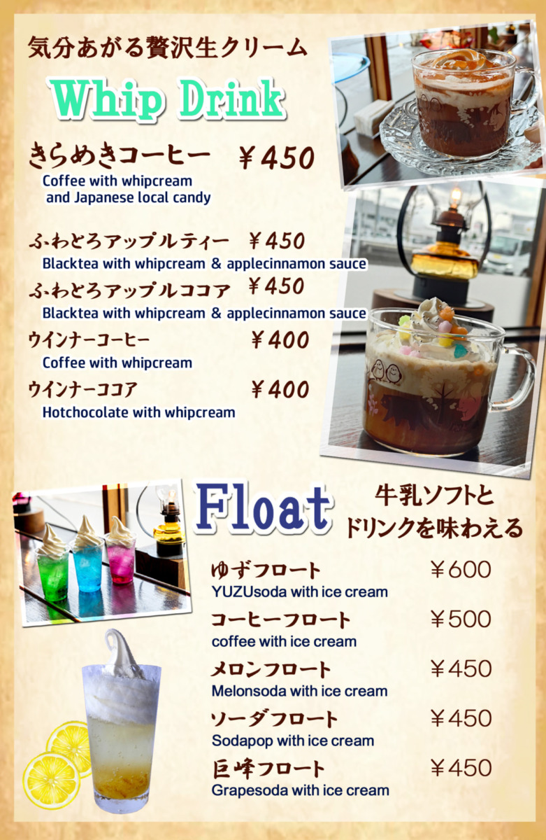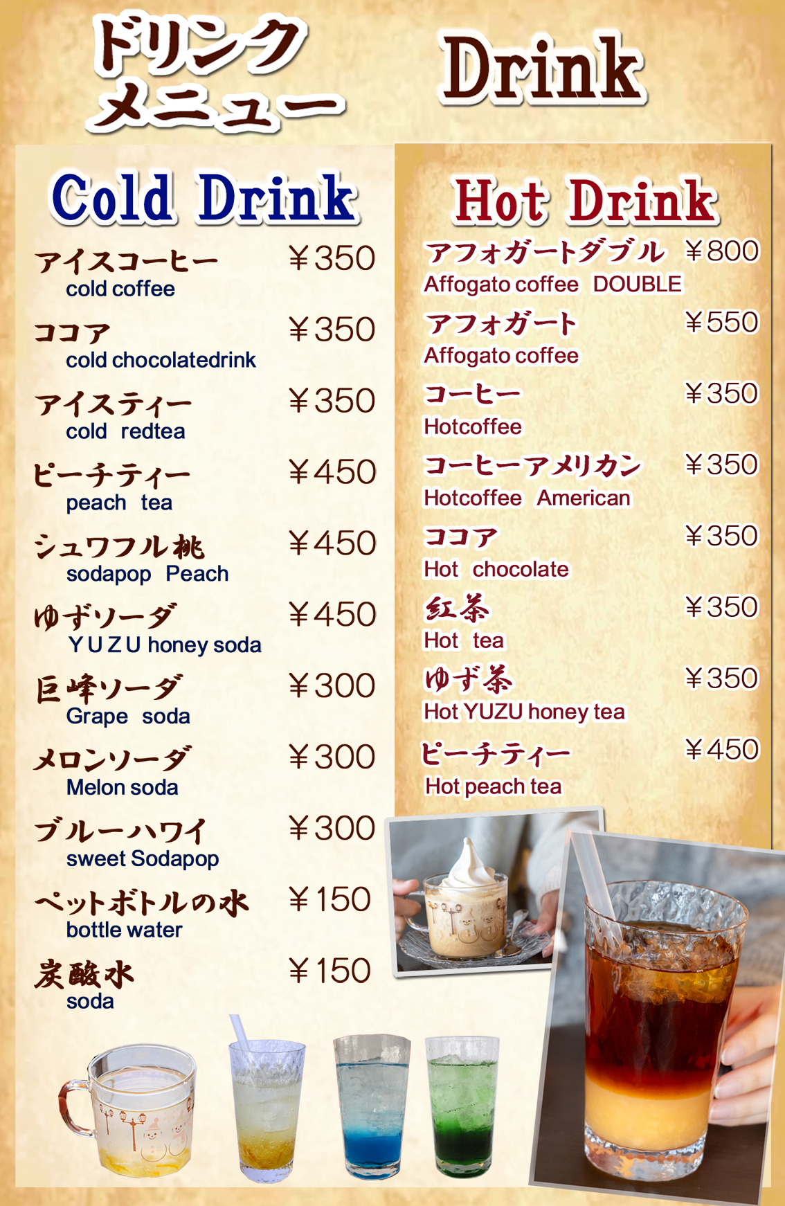詳しくは下のソフトクリームメニュー、ドリンクメニューを